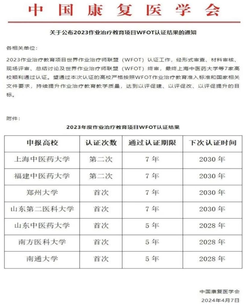 beat365官方网站康复作业治疗专业教育通过WFOT复审认证