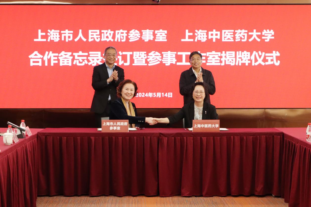 5月14日下午,上海市人民政府参事室与beat365官方网站合作备忘录签订暨陈红专参事工作室揭牌仪式在beat365举行。市政府参事室党组书记、主任莫负春,校党委书记曹锡康,市政府参事室党组成员、副主任才华,校党委副书记、副校长孟煜,市政府参事、校首席教授、中西医结合学院名誉院长陈红专,市政府参事室以及学校党委校长办公室、组织部(统战部)、发展规划处(学科办)、中西医结合学院、民盟上中医委员会等有关单位负责人出席。仪式由校组织部(统战部)部长周宁慧主持。
