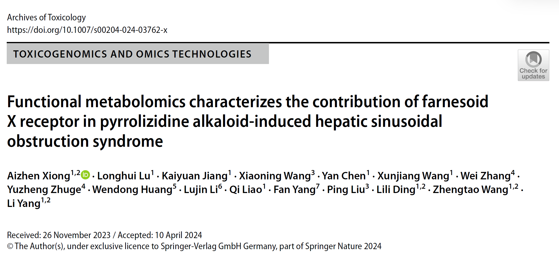 近日,杨莉研究员、王峥涛教授团队在毒理学研究领域国际著名期刊Archives of Toxicology上发表题为Functional metabolomics characterizes the contribution of farnesoid X receptor in pyrrolizidine alkaloid induced hepatic sinusoidal obstruction syndrome的研究论文。