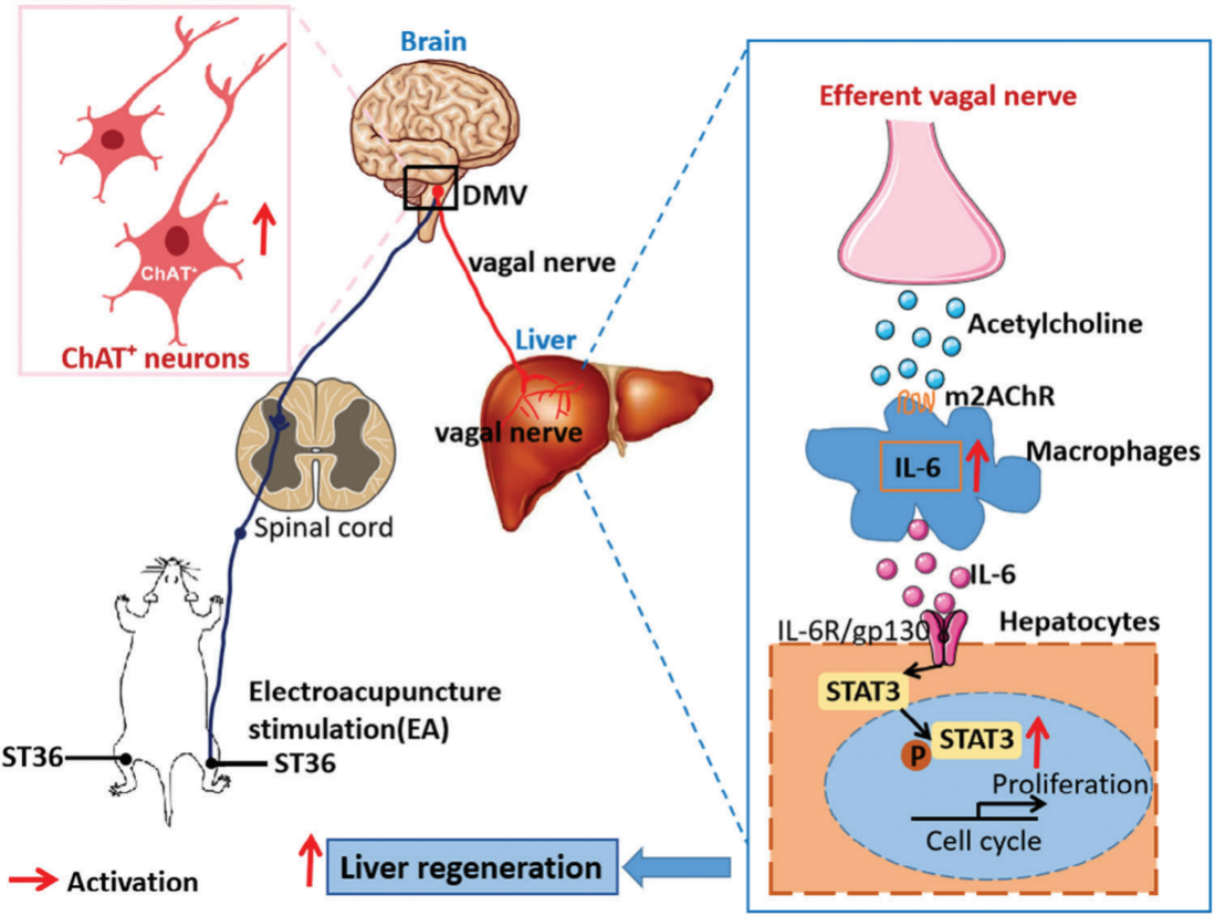 研究表明电针足三里刺激可兴奋迷走神经背外侧核的胆碱能神经元,引起肝脏迷走神经末梢乙酰胆碱的释放增加,激活肝脏巨噬细胞中的IL-6信号通路,最终促进了肝细胞增殖和再生。