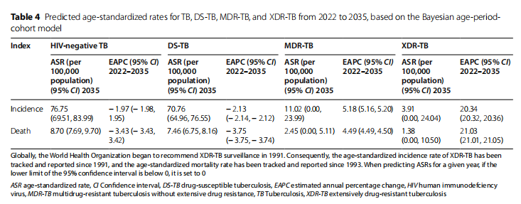 结核病(TB)是一种由结核分枝杆菌引起的传染病,主要影响肺部。尽管结核病可以预防和治愈,它在全球范围内仍然有着高发病率和死亡率,尤其是在低收入和中等收入国家。文章研究分析了1990年至2021年间结核病的发病率、死亡率和伤残调整生命年(DALY)等指标。通过贝叶斯年龄-时期-队列模型(BAPC)预测了未来的发病率和死亡率趋势。研究发现2021年全球HIV阴性结核病的年龄标准化发病率(ASIR)为103.00/10万,与1990年相比下降了40%。全球年龄标准化死亡率(ASMR)为13.96/10万,自1990年以来下降了65%。然而,耐多药结核病(MDR-TB)的ASIR自2015年呈现缓慢上升趋势。广泛耐药性结核病(XDR-TB)的发病率在过去30年显著增加。东亚、东欧、南亚和撒哈拉以南非洲的耐药结核病发病率和死亡率上升趋势尤为显著。研究预测,到2035年,MDR-TB和XDR-TB的发病率和死亡率将呈现显著增加,尤其是在低SDI地区,严重阻碍了WHO及各国政府终止结核的行动。研究建议开发更高效、更准确且便捷的诊断试剂和治疗药物,提高公众卫生教育和社区参与度,这对于遏制结核病传播至关重要。