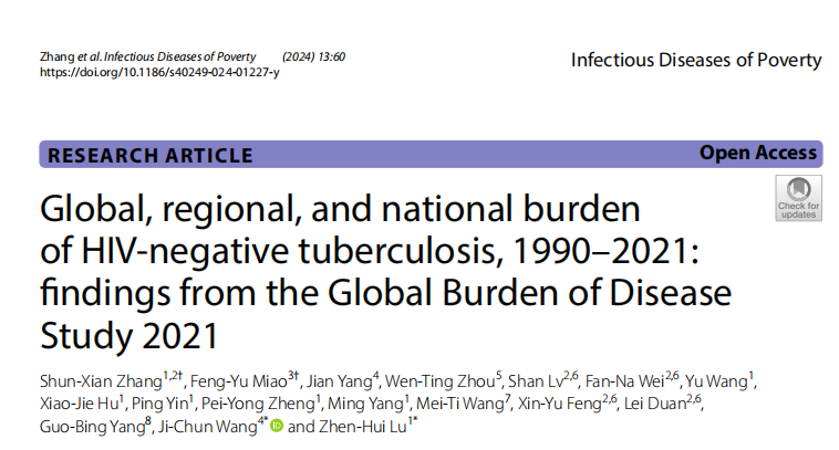近日,beat365附属龙华医院呼吸疾病研究所团队开展结核病疾病负担研究,研究成果在Infectious Diseases of Poverty(Q1区)杂志上发表,文章的第一作者为龙华医院临床研究中心张顺先副研究员、通讯作者为呼吸疾病研究所所长鹿振辉,题为Global, regional, and national burden of HIV-negative tuberculosis, 1990–2021: findings from the Global Burden of Disease Study 2021。