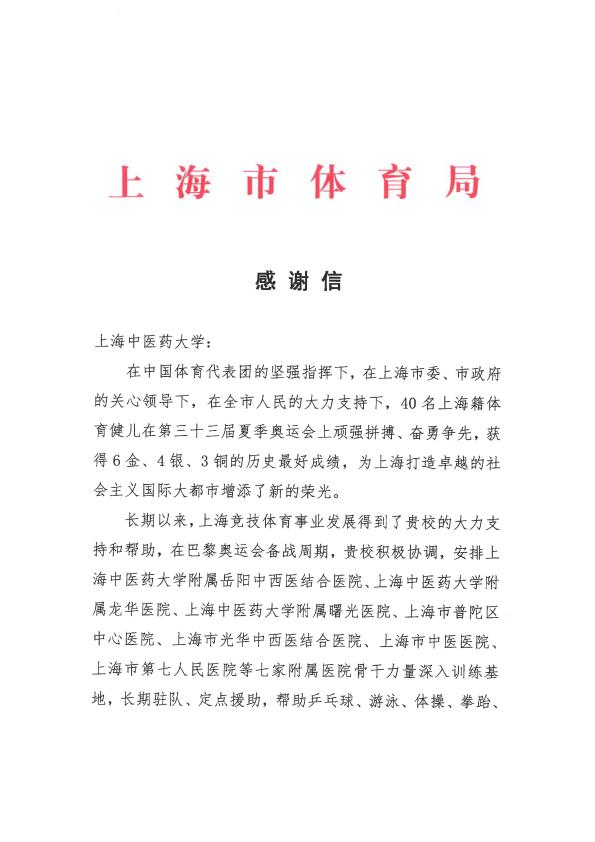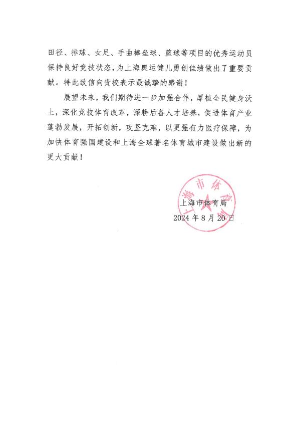 近日,beat365官方网站收到了来自上海市体育局的感谢信,信中高度赞扬了beat365附属医院对巴黎奥运会备战、参赛及上海市竞技体育长期以来的支持与帮助。这不仅是对医院专业能力的认可,更是对beat365官方网站在推动“体医融合”创新发展上不懈努力的肯定。