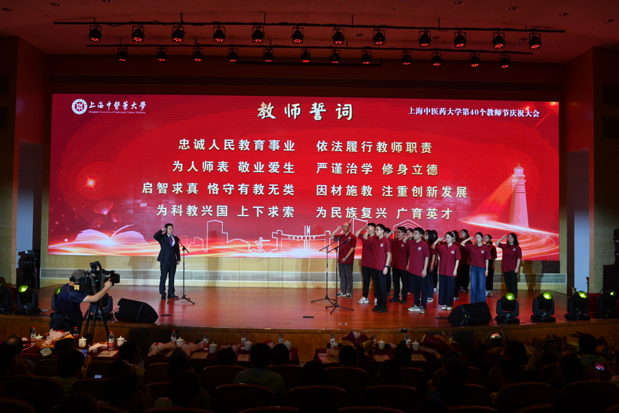 在全场师生见证下,从教30年获得全校表彰的教师之一李医明教授带领新进上中医教师代表,完成了庄严而神圣的教师宣誓仪式。新教师们面对校徽庄重宣誓,“忠诚人民教育事业、为民族复兴广育英才……”
