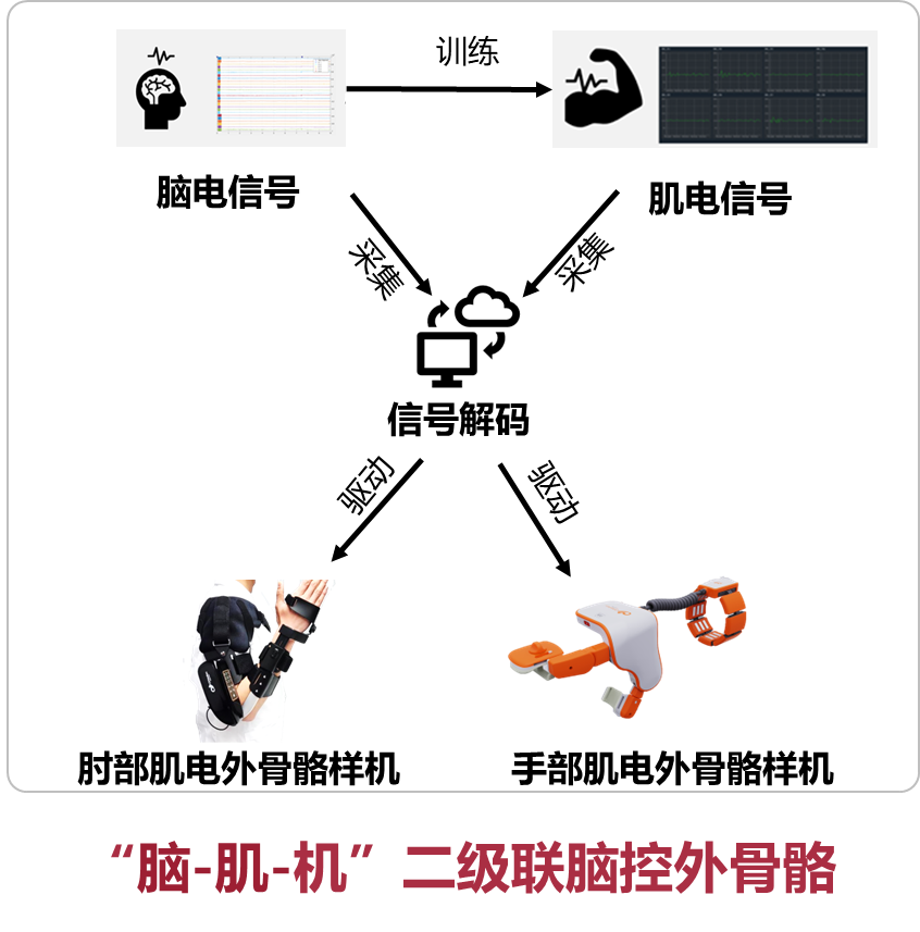 徐建光教授团队针对现有脑机接口技术稳定性差、识别困难不稳定的难题,提出“脑-肌-机”二级联的脑控外骨骼创新理念技术。脑-肌-机接口是一套通过强化训练脑-肌电耦合,利用脑电信号对肌电信号进行训练,从而重建中枢与周围神经的连接,进一步通过肌电信号控制外骨骼,辅助手部运动功能障碍患者实现运动的康复系统。该系统改变了以往以恢复单纯肢体动作为目标的康复模式,创新性地提出了恢复脑-肌电耦合的新康复策略,降低康复难度,缩短康复进程,旨在帮助患者尽快恢复手功能。
