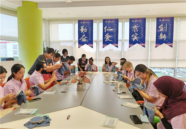 针脚细密,色调典雅,这是苏绣活动板块的内秀之美。一幅幅绣工精湛、栩栩如生的刺绣作品吸引了国际学生们的目光。苏绣,被誉为“东方艺术明珠”,每一处细节都体现了东方匠人的精湛技艺与对美的极致追求。选线,穿针,刺绣,国际学生们在老师的指导下拿起绣针,尝试在蓝色方巾上绣出一片银杏叶,沉浸式感受江南文化的韵味。这方绣好的蓝色方巾既可以用为日常手帕,也是作为品茗时铺展开来的茶巾,为生活注入别样的韵味。