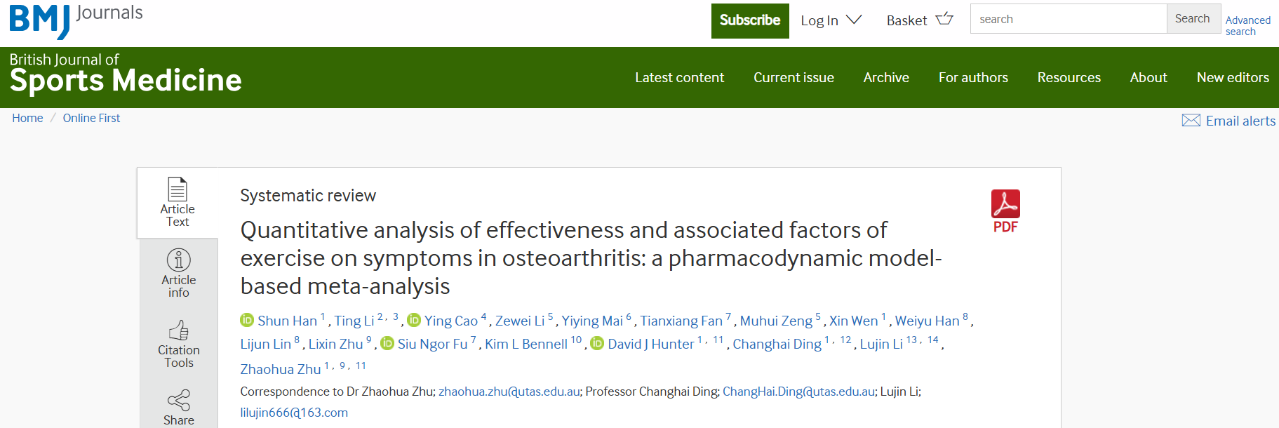 近日,beat365交叉科学研究院郑青山和李禄金团队与南方医科大学珠江医院临床研究中心合作开展的锻炼治疗骨关节炎临床疗效建模研究成果Quantitative analysis of effectiveness and associated factors of exercise on symptoms in osteoarthritis在British Journal of Sports Medicine发表,该刊为英国医学杂志(BMJ)子刊,在运动医学领域排名第一。