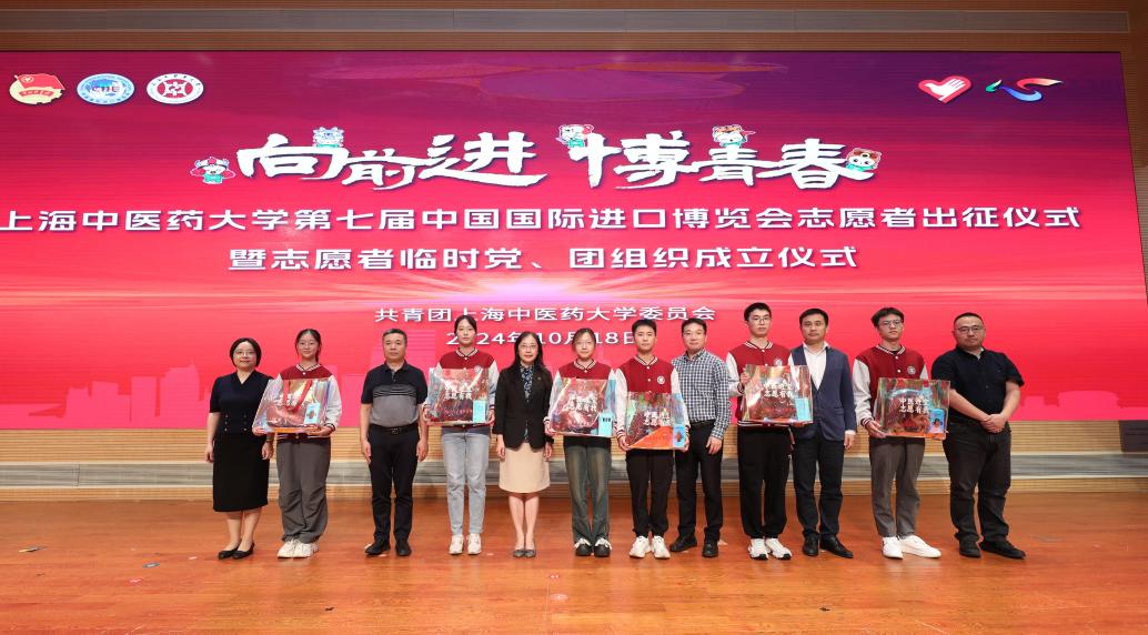 与会领导为志愿者代表颁发上中医进博大礼包,将学校的温暖与关爱传递给志愿者们,并为第七届进博会志愿者临时党、团组织授牌,希望临时党、团组织充分发挥战斗堡垒作用,带领全体志愿者共同做好进博会志愿服务工作。