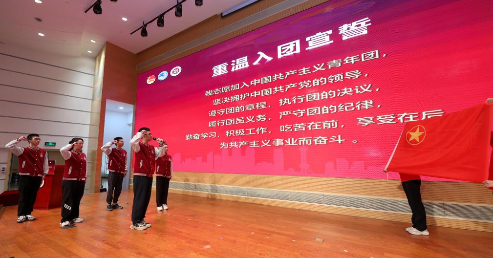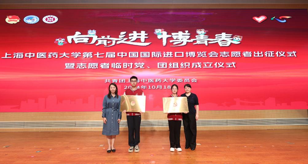 党员志愿者代表和团员志愿者代表面对党旗和团旗再次重温入党、入团誓词,铿锵有力地表达了跟党走、听党话的决心。全体志愿者共同承诺:“以真诚的热情服务各国来宾,以自信和智慧展现岐黄风采,以最饱满的精神,投入进博服务工作。”