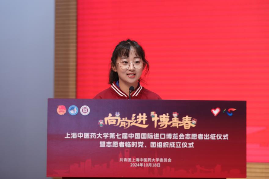 中药学院学生黄宝宇代表第七届进博会志愿者发言,分享了自己的进博梦、志愿情、青春行,表示将肩负重任,挺膺担当,为进博会的圆满举办贡献中医青年的力量,向世界宣告:中国青年有理想、敢担当、能吃苦、肯奋斗。