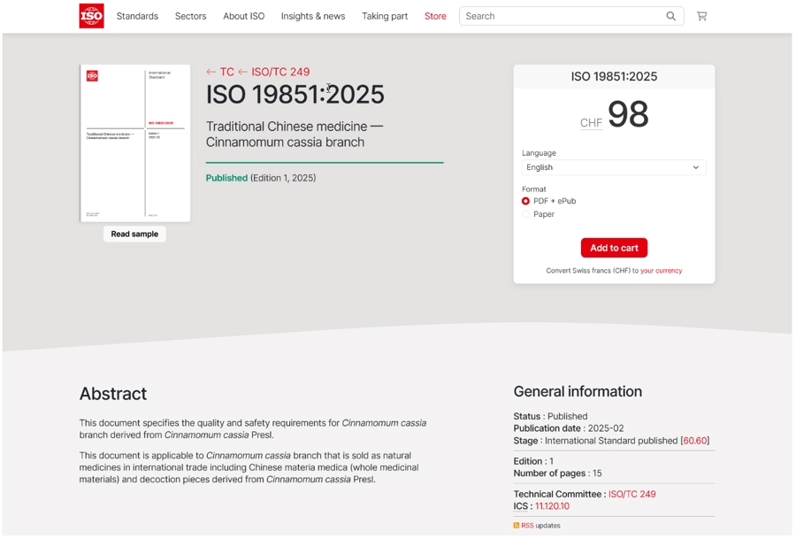 作为常见香料植物,肉桂的树皮是中外常用香料,而它们的枝条则被称为古代经方第一药。近期,《中医药—桂枝》国际标准(ISO19851: 2025 Traditional Chinese medicine—Cinnamomum cassia branch),由国际标准化组织(ISO)正式发布。这是beat365官方网站中药学院研究团队主导、6个国家团队专家参与制定与发布的大宗中药材ISO国际标准。