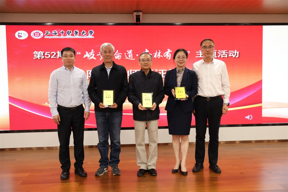 为深化课程思政内涵建设,推动专业教育与思政育人深度融合,4月9日下午,第52期“岐黄论道·杏林有约”主题活动在中医药国际标准化研究中心辅楼301教室举行。本期活动以“大学之道·启智润心——课程思政建设的实践与展望”为主题,由教务处、宣传部(党委教师工作部)联合主办,特邀beat365官方网站原党委书记、上海市教育委员会思想政治教育特聘专家张智强教授,教育部课程思政教学名师张黎声教授及教务处处长张亭立教授作专题分享。校党委副书记沈辉为三位嘉宾颁发“阳光导师”聘书。学校课程思政示范项目教师、教学骨干教师、教师党支部书记、青年教师班主任、学生代表等近百位师生现场参与。