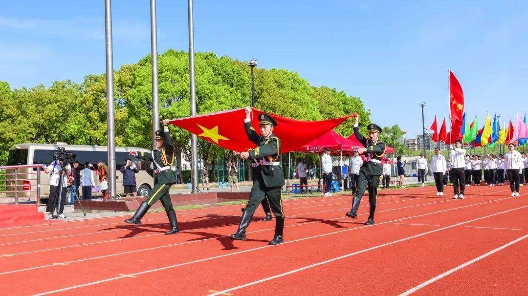 随着雄壮的《运动员进行曲》响起,校国旗护卫队队员擎着鲜艳的五星红旗,身着整齐制服、迈着矫健步伐步入运动场,带领校旗队、彩旗队方阵及学校系统30家单位师生代表运动员表演方阵有序入场。