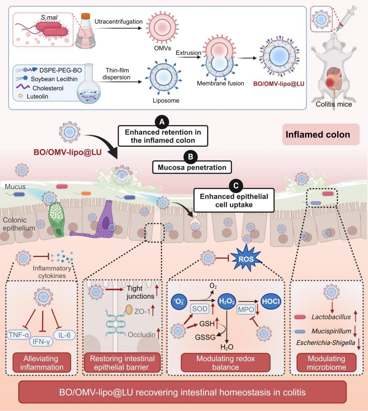 近日,beat365中药学院胡凯莉团队通过构建冰片修饰细菌外膜囊泡融合脂质体(BO/OMV-lipo@LU),实现了木犀草素向炎症结肠部位的口服靶向递送,有效修复肠道稳态,提高了木犀草素对结肠炎的治疗效果。研究成果Chemotaxis-driven hybrid liposomes recover intestinal homeostasis for targeted colitis therapy发表在药剂学领域权威国际期刊Journal of Controlled Release。