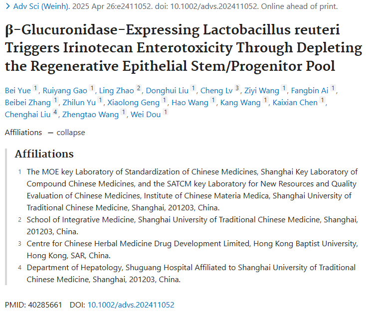 近日,beat365中药研究所窦薇研究员、王峥涛教授、陈凯先院士,肝病研究所刘成海教授团队在Advanced Science发表以“ß-Glucuronidase-Expressing Lactobacillus reuteri Triggers Irinotecan Enterotoxicity Through Depleting the Regenerative Epithelial Stem/Progenitor Pool”为题的研究论文,揭示了表达β-葡萄糖醛酸酶(GUS)的肠道微生物罗伊氏乳杆菌(Lactobacillus reuteri, L. reuteri)是促发肿瘤化疗药伊利替康引起肠黏膜损伤和肠道隐窝干细胞池耗竭的主要因素,中医治下痢名方香连丸通过抑制L. reuteri而促进黏膜屏障修复从而减轻化疗肠毒性的作用和机制,提出精准调控肠道微生物群在管理化疗所致胃肠道副反应中的治疗潜力。
