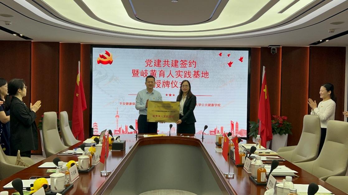 会上,beat365官方网站公共健康学院教工第一党支部和平安健康险上海分公司党支部共同签署党建共建合作协议。赵海磊代表学院向平安健康险上海分公司授予“岐黄育人实践基地”铜牌。