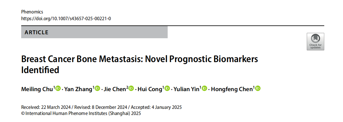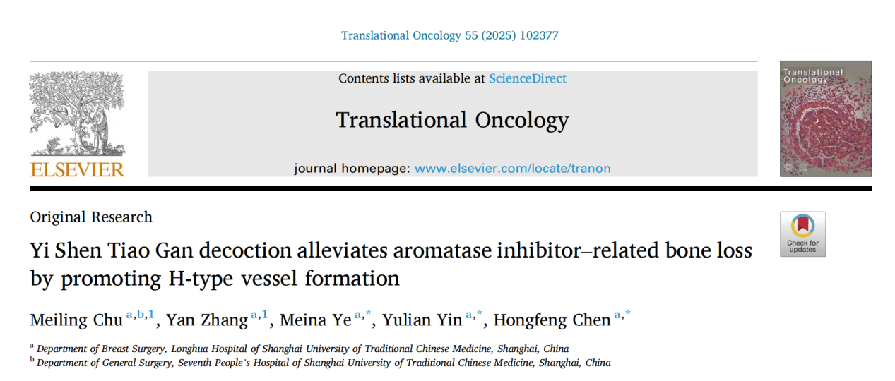 近日,beat365附属龙华医院陈红风教授、叶媚娜主任医师、殷玉莲副主任医师(通讯作者)带领褚美玲博士、张雁博士研究生(第一作者)等团队成员,在Translational Oncology发表题为“Yi Shen Tiao Gan decoction alleviates aromatase inhibitor–related bone loss by promoting H-type vessel formation”的研究论文、在期刊Phenomics发表题为“Breast Cancer Bone Metastasis: Novel Prognostic Biomarkers Identified”的研究论文。首次在构建HR阳性乳腺癌术后骨丢失动物模型的基础上,从骨内H型血管内皮细胞角度,寻找芳香化酶抑制剂相关骨丢失发病机制,提出益肾调肝方治疗芳香化酶抑制剂相关骨丢失的新靶点SLIT3,为研究中医药治疗骨丢失提供新方向;首次基于WGCNA和机器学习筛选乳腺癌骨转移中的脂质代谢相关生物标志物并研究其调控机制,为乳腺癌患者骨转移的进一步研究提供了科学参考,为深入理解骨转移乳腺癌的机制奠定理论基础。