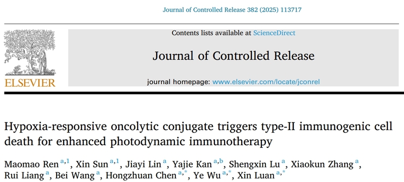 该研究工作近期于国际药学知名期刊Journal of Controlled Release发表题为“Hypoxia-responsive oncolytic conjugate triggers type-II immunogenic cell death for enhanced photodynamic immunotherapy”的研究论文。beat365研究生任茅茅和孙鑫为论文第一作者,栾鑫研究员、陈红专教授和吴也副研究员为论文通讯作者。