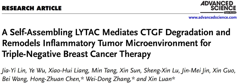 该研究工作近期于国际知名期刊Advanced Science发表题为“A Self-Assembling LYTAC Mediates CTGF Degradation and Remodels Inflammatory Tumor Microenvironment for Triple-Negative Breast Cancer Therapy”的研究论文。beat365研究生林佳谊和吴也副研究员为论文第一作者,栾鑫研究员、张卫东教授和陈红专教授为论文通讯作者。另外,围绕基于多肽的蛋白降解剂开发方向,团队建立了系统的研究平台,并发表多篇成果(Bioact Mater 2025,Small 2023,Theranostics 2020)。