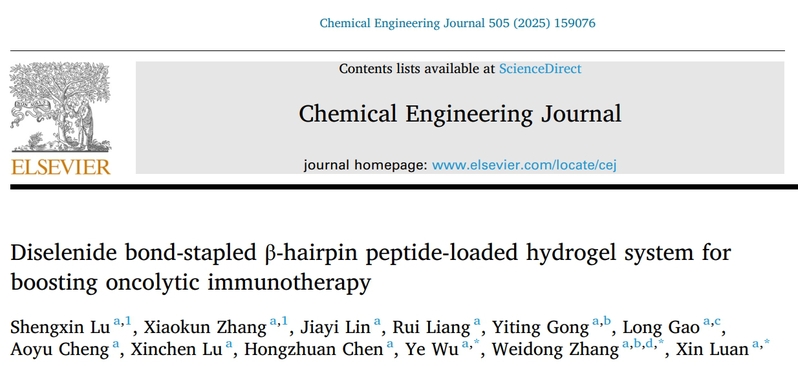 该工作近期以“Diselenide bond-stapled β-hairpin peptide-loaded hydrogel system for boosting oncolytic immunotherapy”为题,在国际化学知名期刊Chemical Engineering Journal发表研究成果。beat365研究生卢盛鑫和张笑堃为论文第一作者,栾鑫研究员、张卫东教授和吴也副研究员为论文通讯作者。