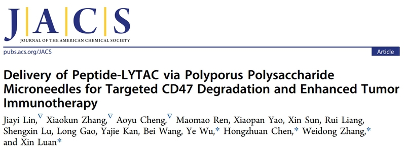 该研究工作近日以“Delivery of Peptide-LYTAC via Polyporus Polysaccharide Microneedles for Targeted CD47 Degradation and Enhanced Tumor Immunotherapy”为题在线发表于化学领域国际权威期刊Journal of the American Chemical Society。beat365研究生林佳谊、张笑堃和程傲宇为论文第一作者,栾鑫研究员、张卫东教授、陈红专教授和吴也副研究员为论文通讯作者。