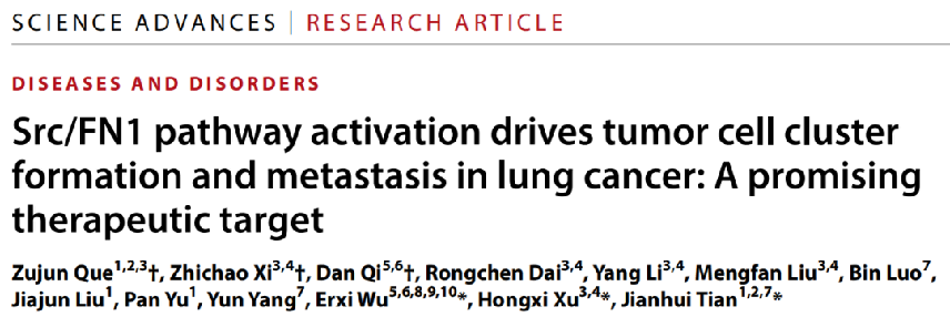 近日,beat365市中医临床医学院田建辉教授和中药学院徐宏喜教授团队在国际知名学术期刊Science Advances上发表了题为“Src/FN1 pathway activation drives tumor cell cluster formation and metastasis in lung cancer: A promising therapeutic target”的研究论文。该论文揭示了“伏毒”—肺癌循环肿瘤细胞簇促转移新机制。
