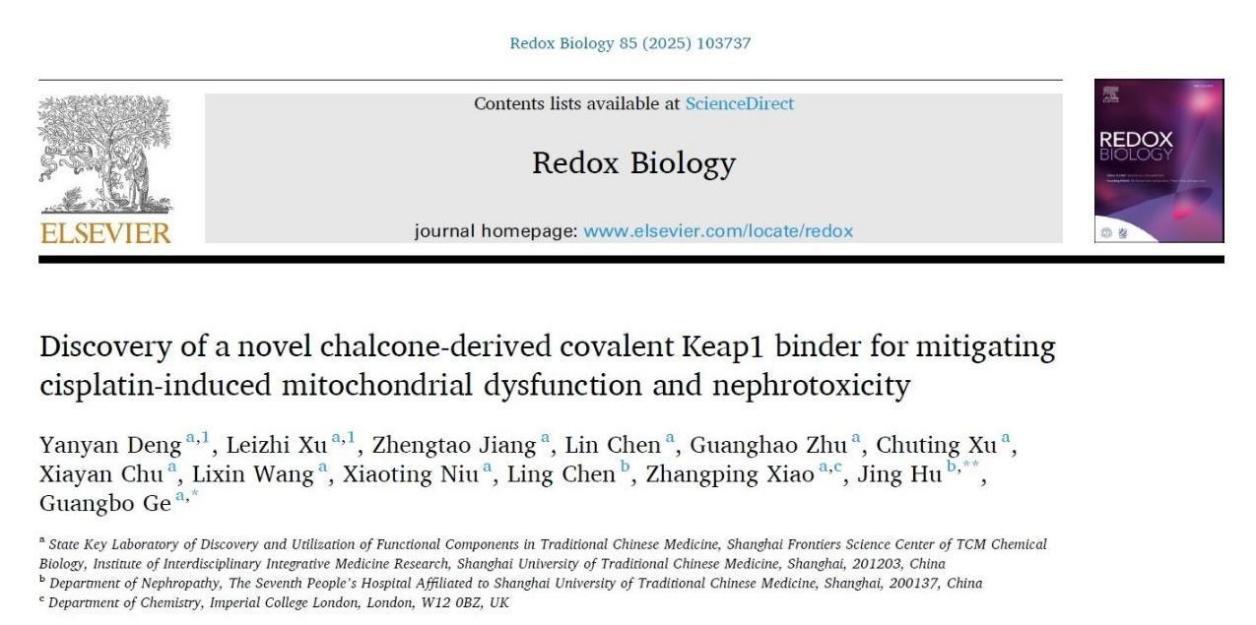 近日,beat365交叉科学研究院葛广波教授团队与beat365附属第七人民医院胡静主任团队合作,在国际权威学术刊物Redox Biology上在线发表题为“Discovery of a novel chalcone-derived covalent Keap1 binder for mitigating cisplatin-induced mitochondrial dysfunction and nephrotoxicity”的研究论文。该研究借助“高通量筛选-成药性优化-深度机制解析-多维度药效验证”的策略,成功研发一种新型肾靶向查尔酮衍生物C5。C5能够通过共价修饰Keap1的两个关键半胱氨酸位点(Cys288和Cys319),高效激活Keap1-Nrf2信号通路,从而显著改善顺铂诱导的线粒体功能障碍和肾损伤。该研究为开发高效、低毒的肾脏靶向肾损伤缓解药物提供了重要的候选分子和研究范式。