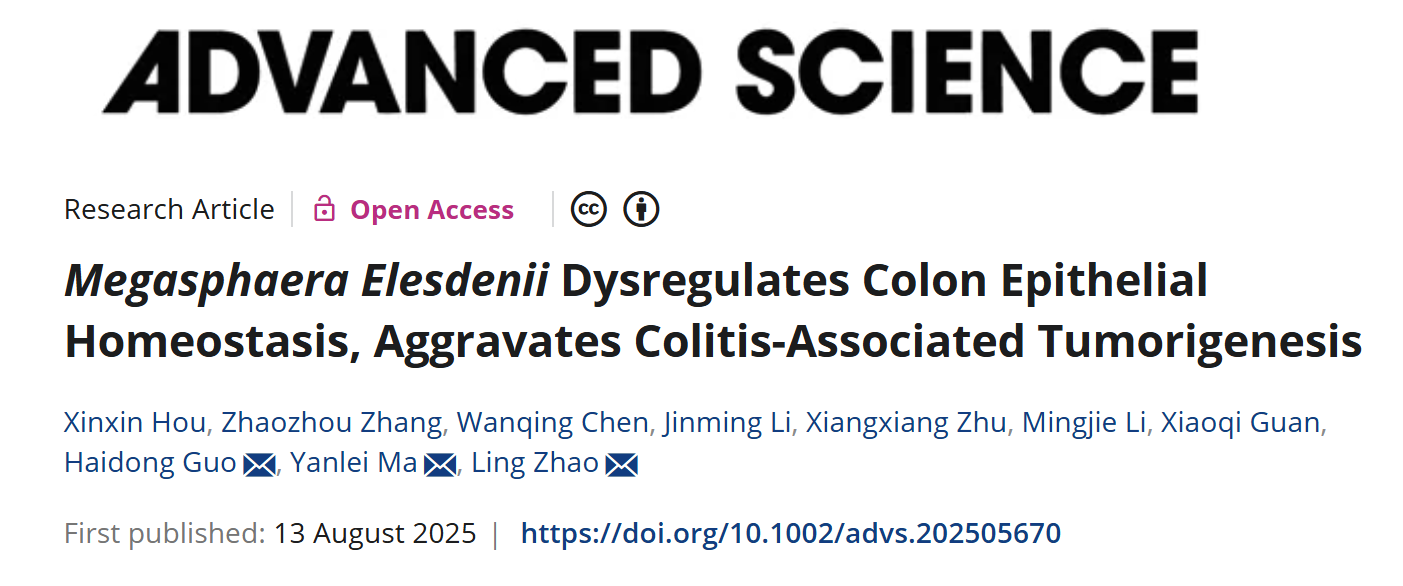 近日,beat365中西医结合学院赵玲研究员、国海东研究员团队与复旦大学附属肿瘤医院马延磊主任团队合作,在国际期刊Advanced Science上发表题为“Megasphaera Elesdenii Dysregulates Colon Epithelial Homeostasis, Aggravates Colitis-Associated Tumorigenesis”的研究成果。
