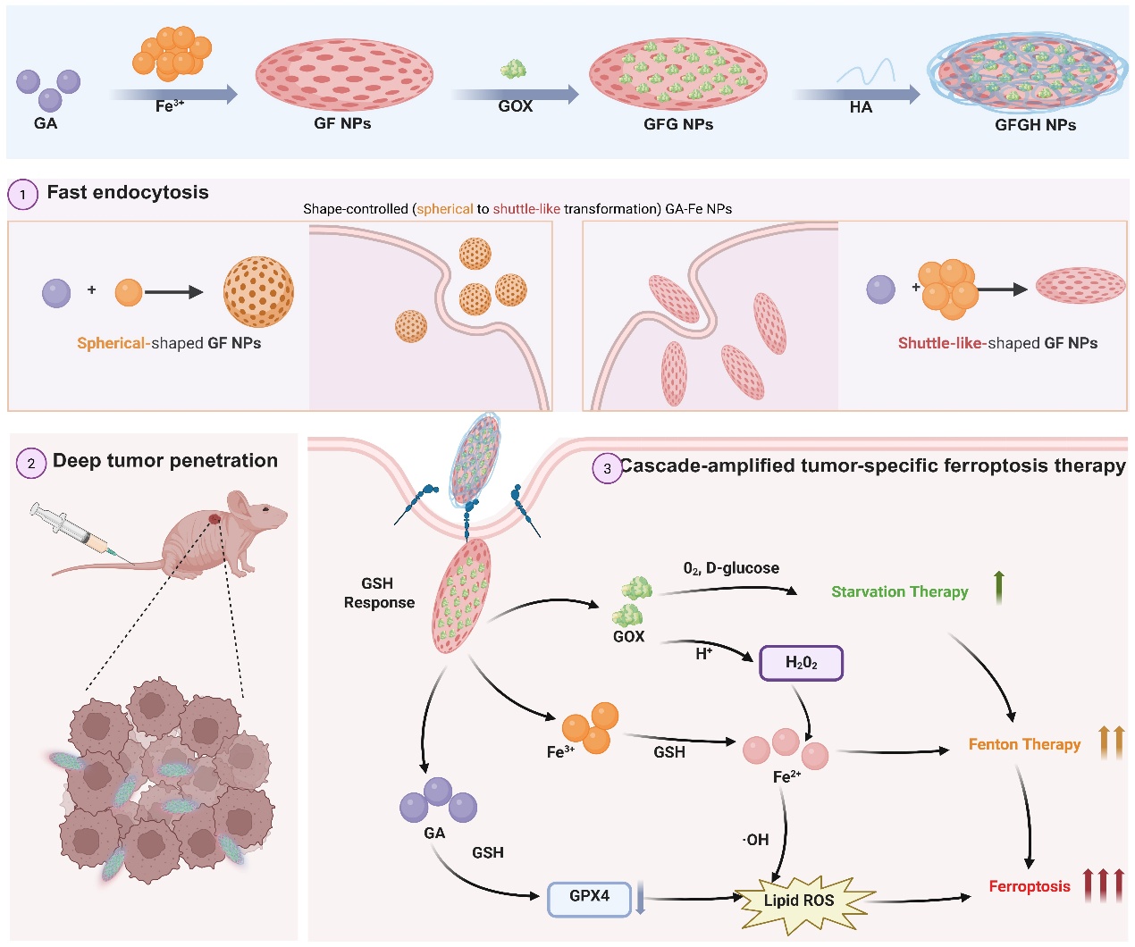 该纳米递药系统巧妙地利用了藤黄酸与铁离子的配位作用,成功构建了形状可控(球形-梭形)的GF NPs;并进一步装载葡萄糖氧化酶(GOX)及修饰透明质酸(HA)最终形成GFGH NPs。GFGH NPs独特的梭形形态使其能高效地穿透肿瘤组织并被癌细胞大量摄取。进入细胞后,GFGH NPs在肿瘤细胞内高浓度的GSH环境中迅速响应,裂解释放出藤黄酸、亚铁离子(铁离子还原)和GOX。三者协同作用,形成强大的“组合拳”:(1)GOX通过消耗葡萄糖产生饥饿疗法效果,同时提供酸性环境和H2O2;(2)亚铁离子在酸性环境下通过Fenton反应,将H2O2转化为大量杀伤性的羟基自由基;(3)藤黄酸进一步消耗细胞内GSH,并下调铁死亡关键蛋白谷胱甘肽过氧化物酶4(GPX4);最终共同导致脂质过氧化物无法被及时清除而大量堆积,最终高效诱导细胞铁死亡