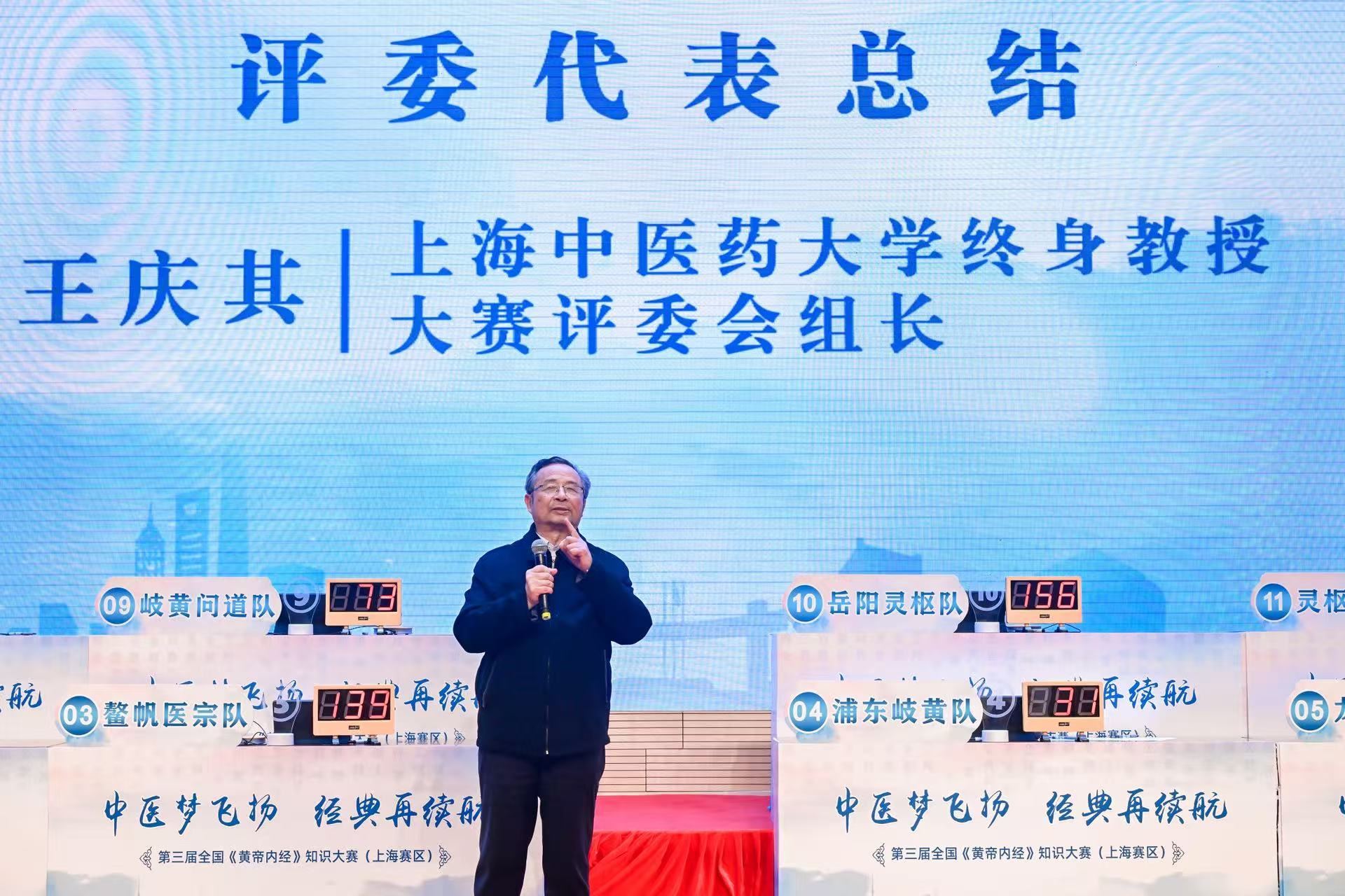 评委组组长王庆其教授在点评中高度赞扬各队的出色表现。他强调,《黄帝内经》不仅是医学理论经典,更是融合传统文化、哲学思想与古代临床经验的百科全书,蕴含着深厚的古人智慧。他勉励同学们:一要精读原文,深入理解;二要学以致用,将经典智慧融入学习、科研与临床;三要弘扬经典,让中医经典在当代学习与实践中持续发光发热。