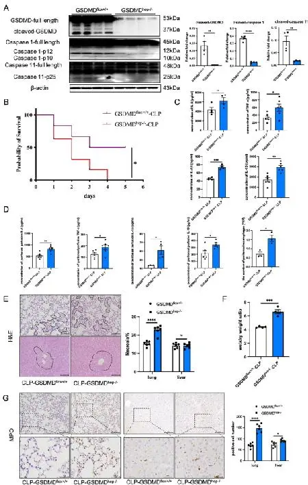 研究团队通过基因编辑技术,构建了肝细胞特异性GSDMD敲除(GSDMDhep⁻/⁻)的小鼠模型。在经典的脓毒症模型实验中,观察到与传统认知不同的现象:GSDMD的缺失非但没有缓解病情,反而显著加重了脓毒症小鼠的炎症反应和多器官损伤,并降低了其生存率。这一发现改变了“GSDMD主要促进炎症”的传统观点。