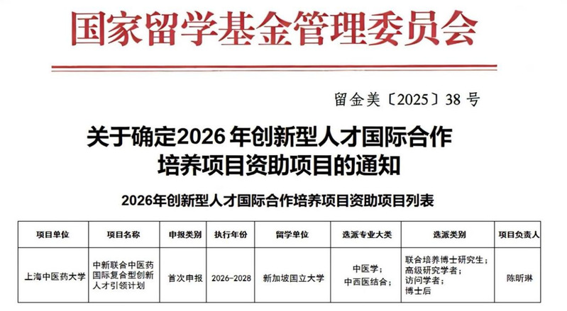 近日,国家留学基金管理委员会公布了2026年“创新型人才国际合作培养项目”立项结果。龙华医院申报的“中新联合中医药国际复合型创新人才引领计划”成功获批。