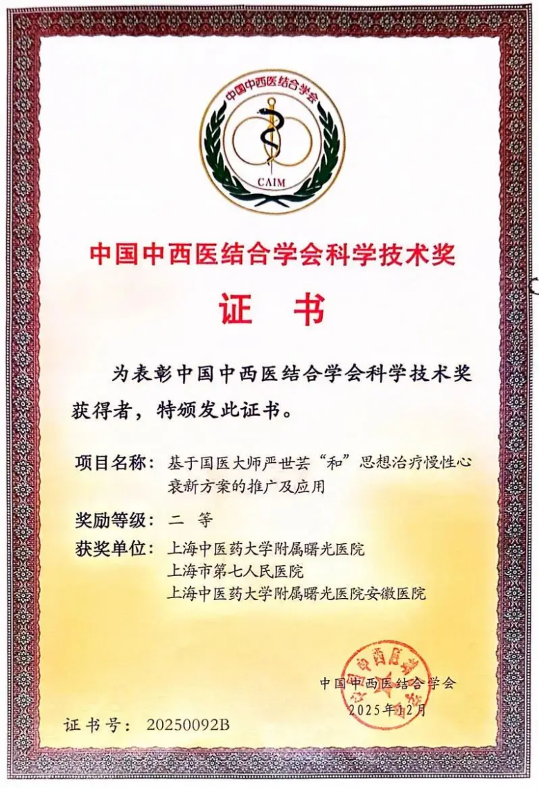 附属曙光医院刘永明领衔团队传承与创新国医大师严世芸“和”思想治疗慢性心衰的学术体系,确立慢性心衰“荣通气血,调和阴阳”治则,形成慢性心衰治疗新方案,突破性解决慢性心衰患者运动能力下降的瓶颈问题,并运用现代科技手段为“和”思想治疗慢性心衰提供现代科学证据。项目已发表相关论文50篇,其中SCI(包括心血管领域顶刊Circulation)收录20篇,被他引共650次。获中国工程院及国自然基金项目10余项,国家发明专利授权6项,执笔完成1份中国工程院国家高端智库研究报告,获国家级及市级人才培养项目2项,建立了一支科技创新人才梯队。已在上海、河南、安徽等全国各级医院广泛推广应用,受益慢性心衰患者达40万余人次。