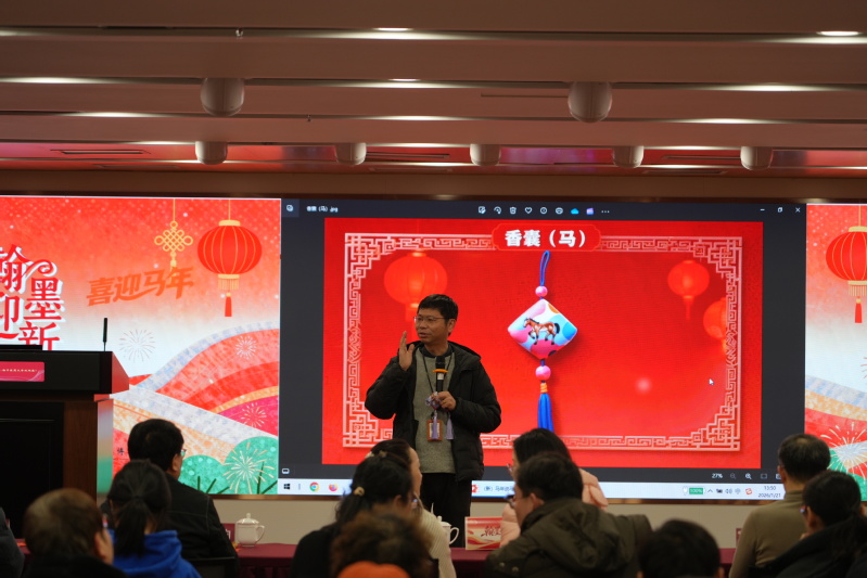 博物馆党支部副书记郭峰现场为大家展示了精心设计的新春香囊。香囊以骏马为形,缀以丝质挂穗,巧妙融合生肖寓意与中医药防病保健的智慧,在缕缕药香中传递安康吉祥的节日祝福。