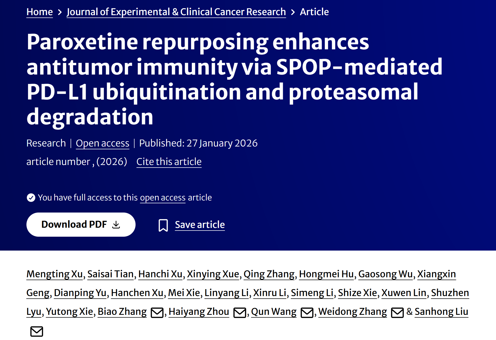 近日,beat365交叉科学研究院刘三宏团队联合海军军医大学张卫东团队及长征医院周海洋团队,在国际知名学术期刊《Journal of Experimental & Clinical Cancer Research》发表研究成果。论文以“Paroxetine repurposing enhances antitumor immunity via SPOP-mediated PD-L1 ubiquitination and proteasomal degradation”为题,系统阐明常用抗抑郁药物帕罗西汀可通过降解免疫抑制蛋白PD-L1激活肿瘤免疫,成功实现“老药新用”。这一发现为肿瘤免疫治疗提供了已上市、低成本、可口服的新型治疗选择,临床转化前景十分广阔。
