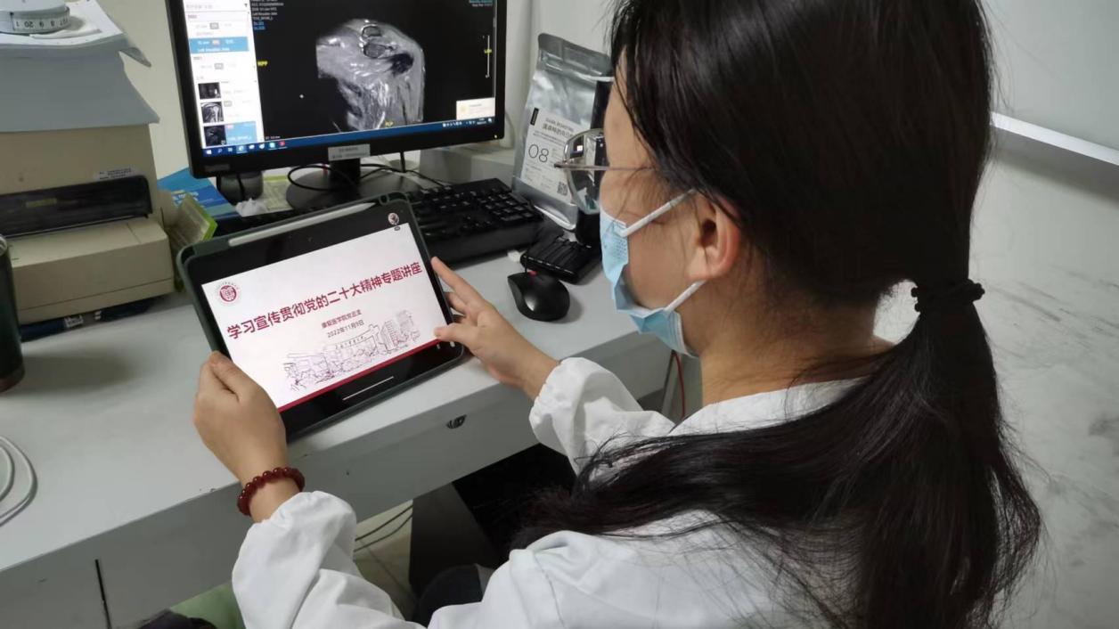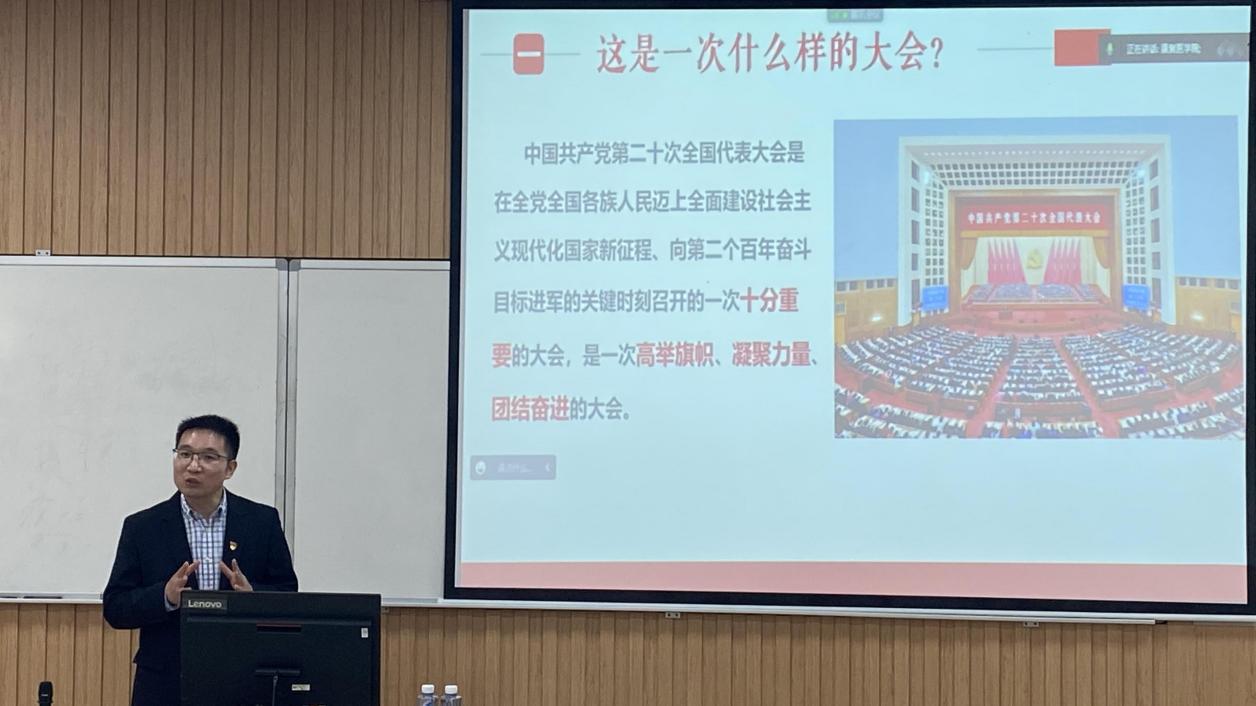 为深入学习宣传贯彻党的二十大精神,引领全院师生在学深悟透中汲取奋进力量,康复医学院举办“深入学习宣传贯彻党的二十大精神”专题系列党课讲座,首场讲座于11月9日开讲。院领导班子、全体教师、学生党员于主会场10105教室参加学习,惠南校区学生于该校区分会场参加学习,其余学生全部线上参与学习。本次讲座由康复医学院党总支副书记毕亚男主持。