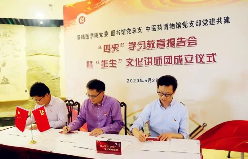 5月29日,为贯彻落实校党委“四史”学习教育实施方案要求,上好“四史”必修课,基础医学院党委、图书馆党总支和博物馆党支部在上海中医药博物馆开展“一院二馆”党建共建活动,举办“四史”学习教育首场报告会暨“生生”文化讲师团成立仪式。校党委副书记、纪委书记许铁峰出席并讲话。学校终身教授段逸山、王庆其,基础医学院、博物馆、图书馆师生党员代表参加。基础医学院党委书记陈晓主持会议。