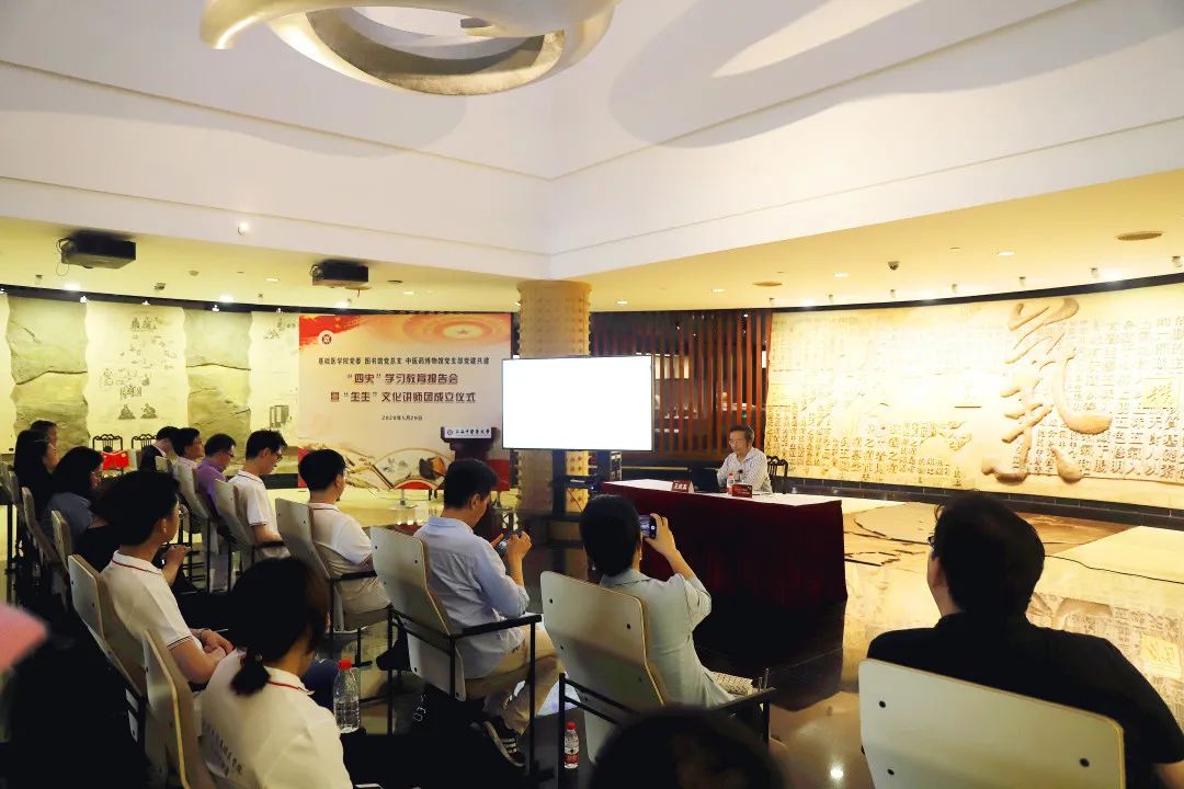 仪式结束后,王庆其作“四史”教育首场报告,这场报告也是基础医学院党委在“四史”教育中着力打造“初心学堂”的重要内容。王庆其认为,高等中医药院校开展“四史”教育的重要意义在于坚持党建引领,传承发展中医药事业,弘扬中医药文化。他回顾20余年求医之路感慨道:“我是党的中医政策的直接受益者,有幸处在我国中医药发展的最好时期,得国家师承政策的阳光,又得恩师之荫佑。导师的谆谆教诲,给于我的成长留下了永恒的‘能源’。”他指出,在新冠肺炎疫情防控工作中,中医药在病因、治法、用药等方面有着突出优势,我们有充分的理由和充足的底气坚定文化自信,传播中医药文化,弘扬中国精神,提供中国方案。王庆其鼓励青年学子做当代“明医”,即“明担当”“明思路”“明定位”。同时,他强调教育者要坚定不移地把增强中医院校学生爱中医、信中医、用中医、传承中医的自觉意识作为中医教育的出发点和落脚点,努力把中华文明的原创瑰宝继承好、发展好、利用好。