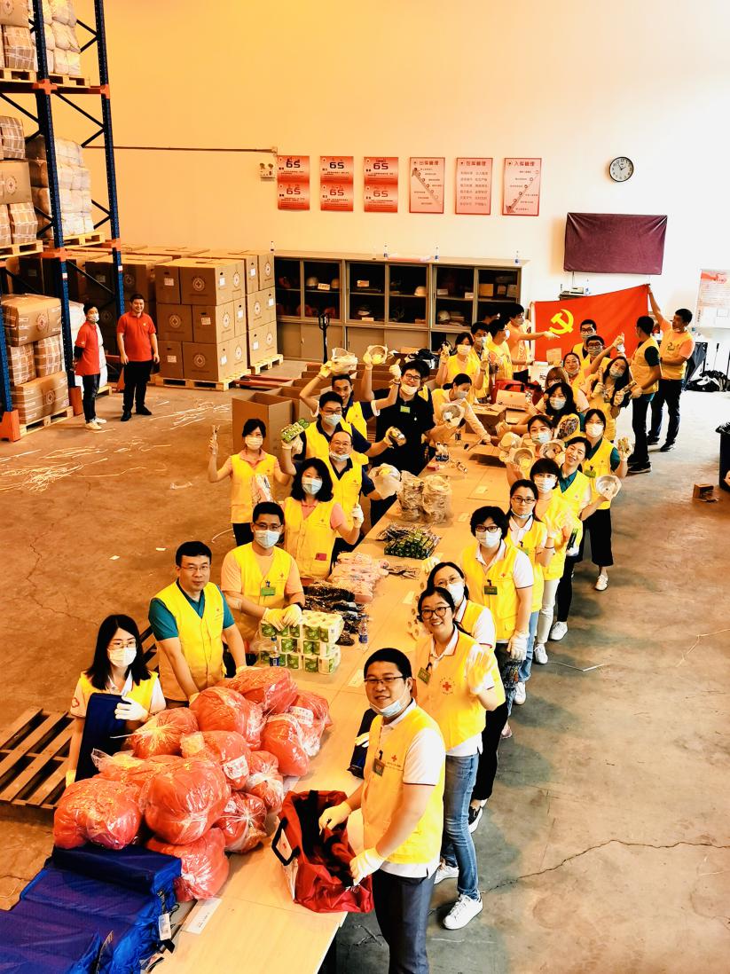 “一方有难,八方支援。”上海市红十字会备灾救灾中心长期收到来自社会各界善心人士捐赠的物资与善款,经过合理的运筹与调配,以备灾难来临后的不时之需。本次曙光医院行政党总支的任务是装填、打包500个家庭紧急救助包。家庭救助包是上海市红十字备灾救灾中心一款常备应急救灾物资。该救助包以解决3口之家应急需求为主要目标,配置了地席、毛毯、雨具、拖鞋以及多功能手电等17种实用的日常生活必备品。行政总支的党员志愿者们和青年文明号的团员志愿者们到达中心第四仓库后,经过中心工作人员短暂的岗前培训后便投入作业,形成流水线,分工明确、相互配合,以超高的效率完成了作业任务。
