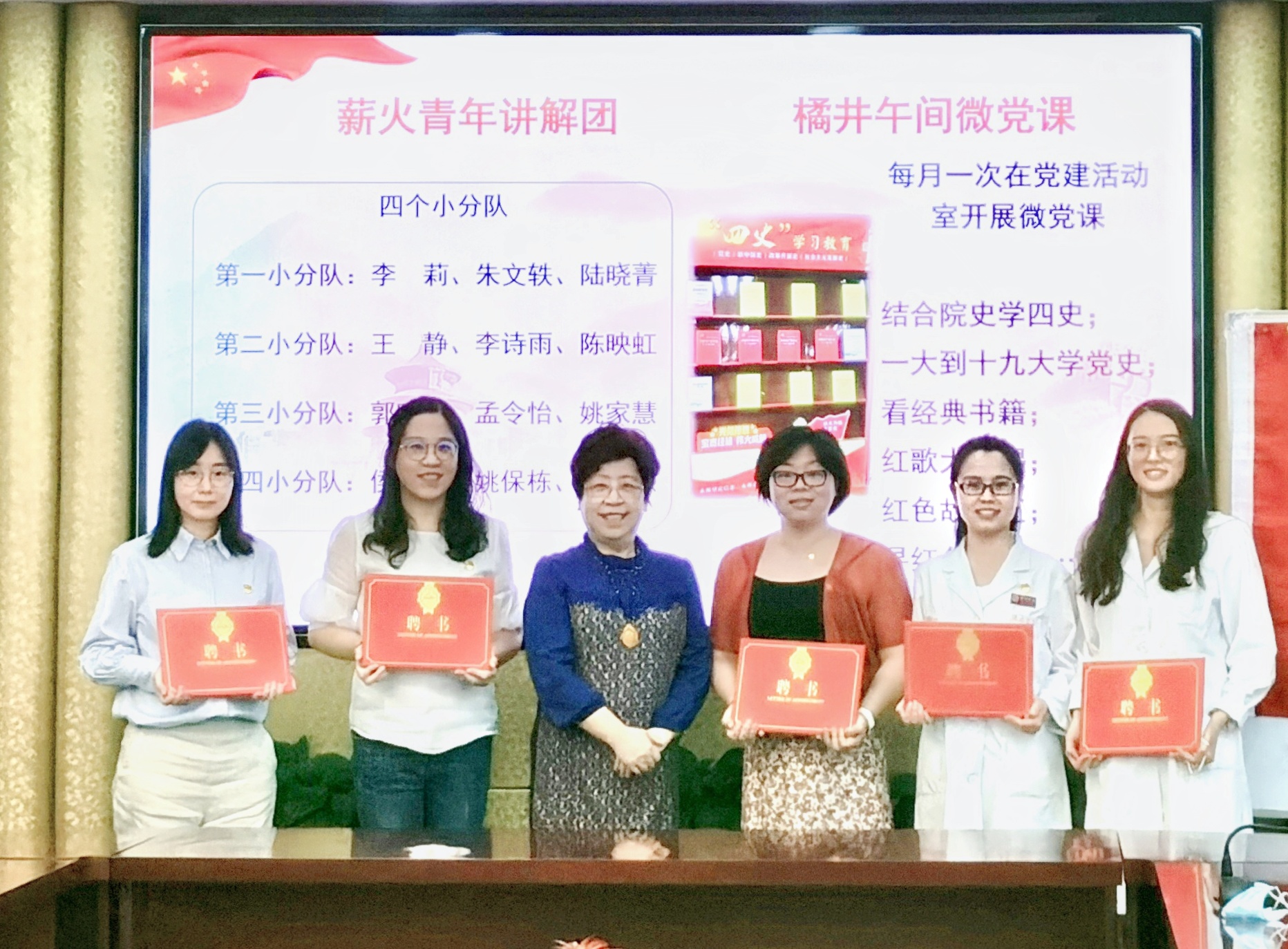 6月9日中午,附属曙光医院行政一支部开展“四史”学习教育动员,聘任了第一批“薪火”青年讲解团,讲解团共12位成员,曙光医院党委书记马俊坚为他们颁发了聘书。讲解团成员们在去年医院举办的《伟大开端——中国共产党创建历史陈列》展览中已经讲解多次,今年在中华艺术宫《“召唤”——上海市抗击新冠肺炎疫情美术、摄影主题展》中再次上岗。当日,讲解团会结合“四史”学习开展系列“橘井”午间微课堂。
