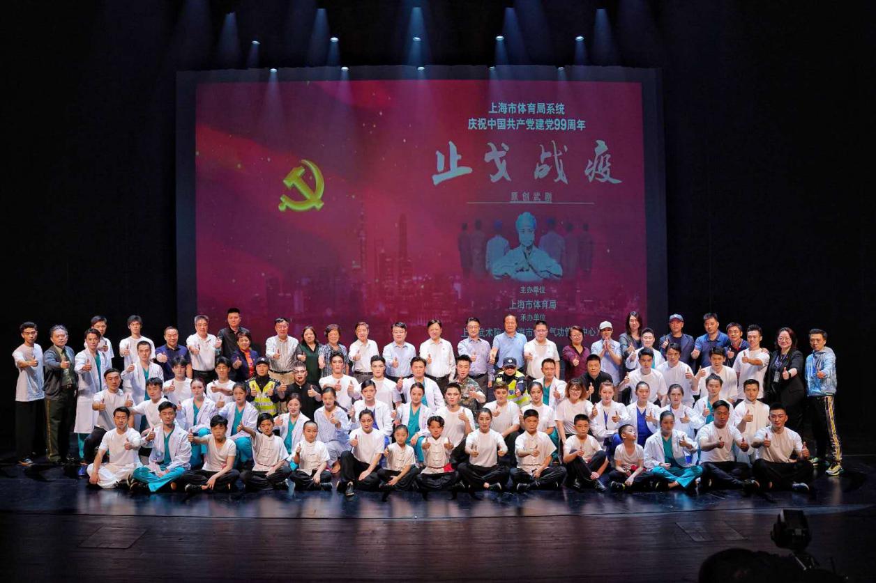 7月6日,为庆祝中国共产党成立99周年,向战斗在抗疫一线的“逆行者”们致敬,由上海市体育局牵头组织全国首个以抗疫为主题的原创武术舞台剧在上海国际舞蹈中心精彩上演。beat365体育部党支部应上海市体育局直属机关党委的邀请,参与“一支部一特色”共建活动。活动期间,《止戈战疫》节目聘请校体育部党支部宣传委员、武术队总教练陆松廷担任总导演,邀请校武术队队员共同参演。
