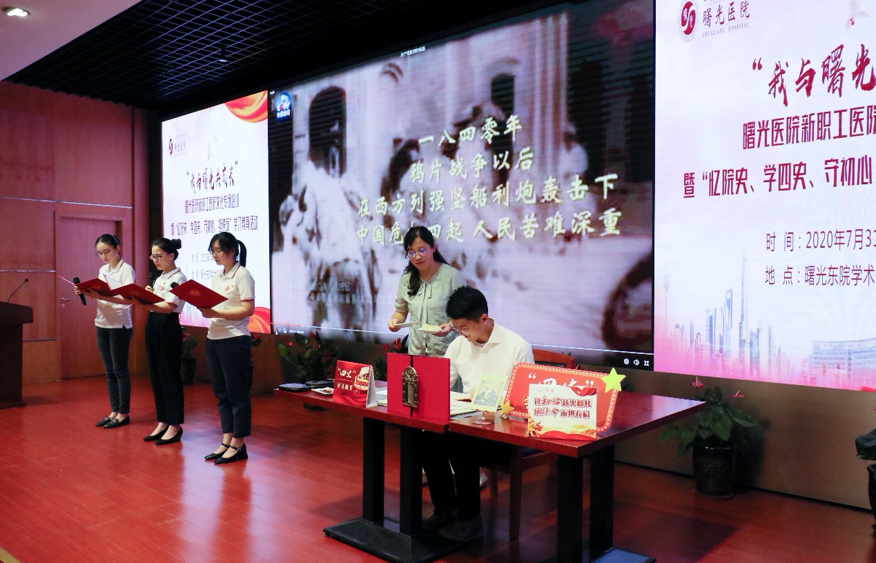 学史明今,开展“四史”学习教育,是建立“不忘初心、牢记使命”长效机制的重要内容。为庆祝中国共产党成立九十九周年,提高职工“四史”学习教育热情,丰富“四史”学习教育形式,推进“四史”学习教育进程。7月31日下午,由曙光医院党委主办,人力资源部与关心下一代工作委员会承办的“我与曙光共成长”曙光医院新职工医院文化专场培训暨“忆院史、学四史、守初心、担使命”学习教育活动在东院学术报告厅顺利举行。曙光医院党委书记马俊坚、党委副书记姚政、副院长竺炯、总会计师张新苹出席活动,2020年曙光医院新职工、规培医师、行政党总支党员同志参加学习。