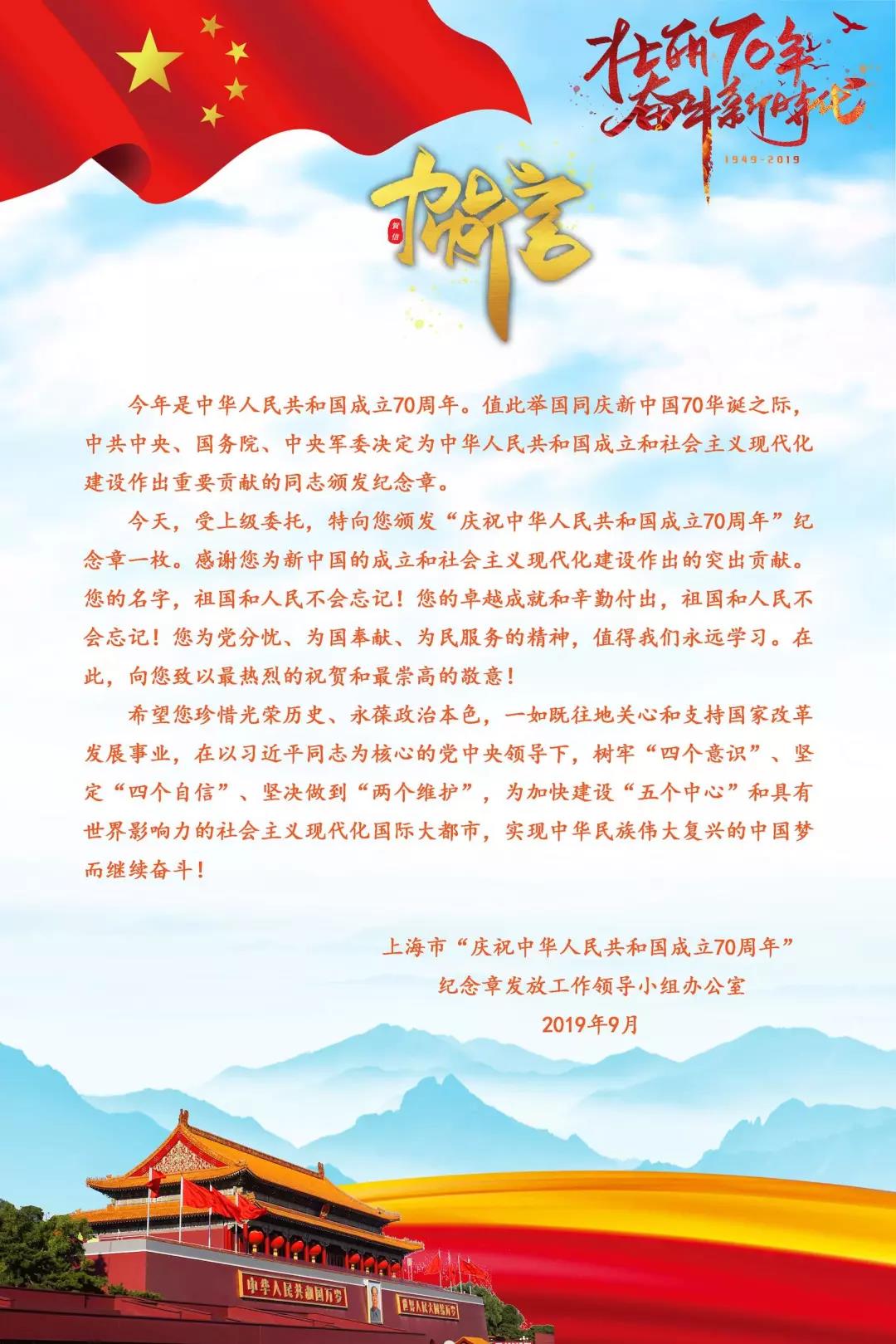 今年是中华人民共和国成立70周年,值此举国同庆之际,中共中央、国务院、中央军委决定向为中华人民共和国成立和社会主义现代化建设作出重要贡献的同志颁发纪念章。