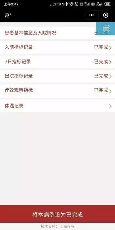 管理软件的开发旨在解决当前新型冠状病毒防疫过程中临床患者数据管理难、患者中西医疗效评价难两个方面难题,反复多次远程讨论和修定。在考虑软件选型时,结合临床收治患者情况复杂,一线医生任务重等实际情况,最终确定开发敏捷、使用便捷的微信小程序。软件研发过程中充分利用既往与企业在计算机和大数据技术的合作基础,迅速组织力量投入小程序的设计、服务器部署、软件测试等一系列研发工作。经过6天高效率、高质量地研发,2月16日完成小程序初步测试,2月17日投入临床使用,为新冠肺炎患者的数据管理、临床疗效评价起到了积极支撑作用。
