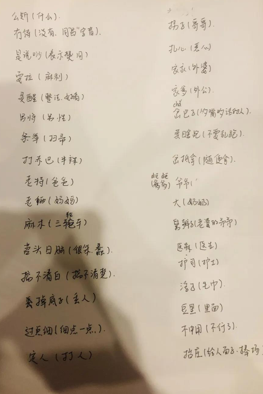 因为是当地人,在雷神山医院C4病区吴凡充当了“小翻译”。也整理了一些武汉话常用语翻译给同事们:老特(爸爸、老爸),老俩(妈妈),家家(外婆),家爹(外公),麻木(三轮车),耍拉(麻利、动作快又干净利落)等等……