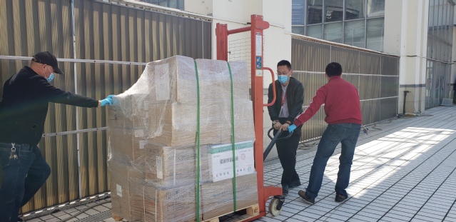后勤工作人员辛勤搬运beat365援鄂医疗队驰援武汉医疗物资