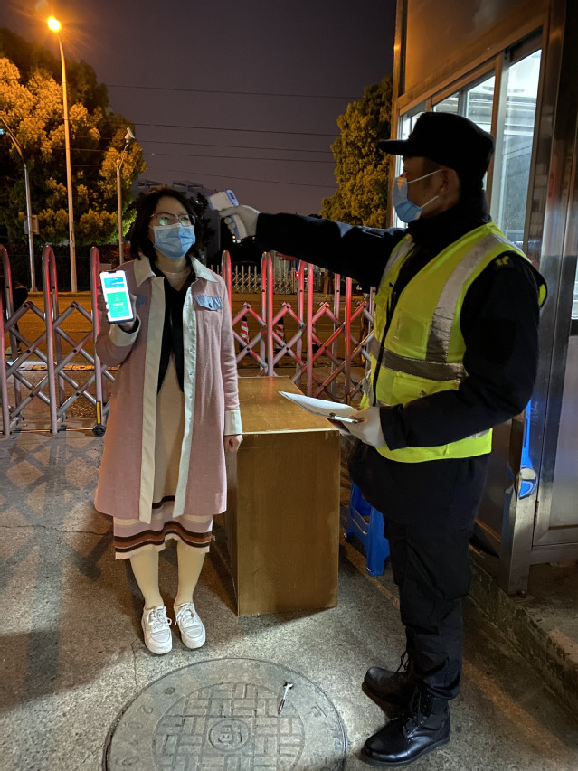 疫情防控期间,校园实施封闭式管理。学校出入口门岗安保对进校人员逐一核查电子通行证、测量体温登记,24小时坚守岗位,毫不懈