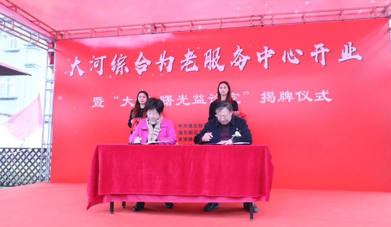 曙光医院党委副书记姚政与老港镇党委副书记张顺龙为“大河——曙光益诊室”揭牌。这块牌子将悬挂于大河综合为老服务中心。“曙光益诊室”成立于2016年,是医院党委与淮海街道党工委进行区域党建共建的特色志愿服务品牌,当时的“淮海+曙光益诊室”开在楼宇里,深受白领们的热捧。