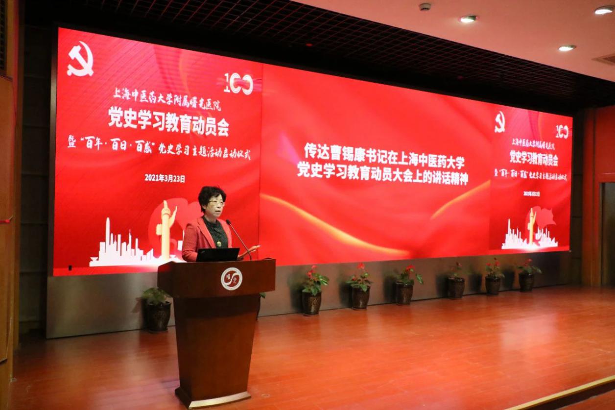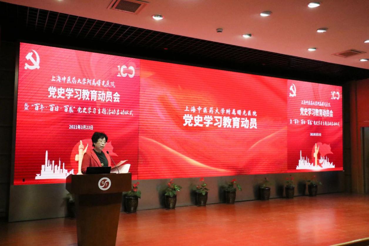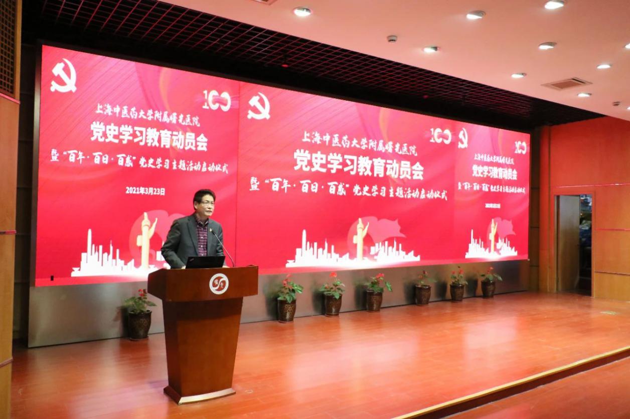 为深入学习贯彻习近平总书记在党史学习教育动员大会上的重要讲话精神和党中央《关于在全党开展党史学习教育的通知》精神,落实市委、教育部、市教委工作党委、beat365官方网站党委的有关要求和部署,3月23日下午,附属曙光医院召开党史学习教育动员会暨“百年·百日·百感”党史学习主题活动启动仪式。曙光医院党政领导班子、党委委员、党支部书记及委员、行政职能科室负责人、临床科室主任、研究室主任等参会。医院党建共建单位上海市委党校谷宇教授、中共一大会址纪念馆李家佳应邀出席。会议由医院党委副书记、院长周华主持。