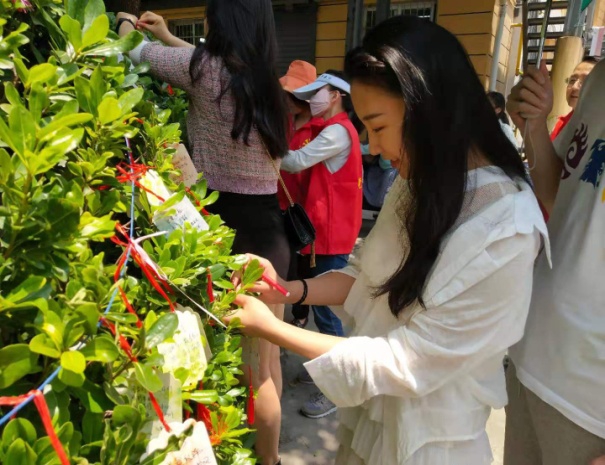 活动现场,在祈福树旁,毕业生们纷纷驻足,认真品读卡片上的谆谆寄语,掏出手机拍照留念,并在祈愿卡上亲笔写下自己的毕业愿望,亲手在树枝上系上自己的美好祝托,许下对未来生活的憧憬和希冀。